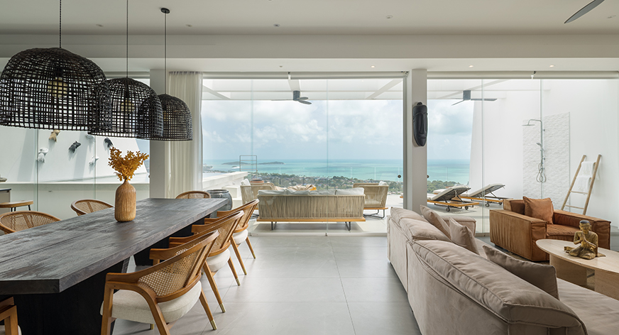 The Blossom Villa boasts three bedrooms across two levels, offering a seamless blend of elegance and comfort. Step inside to discover a refined living space where floor-to-ceiling glass doors frame mesmerising sea views. While the scenery is undeniably captivating, the villa’s artistic décor—expressed through striking wall art and sculptures—adds its own charm.
