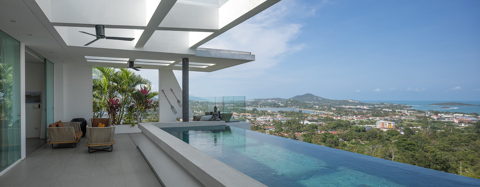 Envision stepping onto the expansive balconies that extend along the villa's front, each level presenting its own unique perspective of the breathtaking seascape. On the main balcony, you find yourself drawn to the long dipping pool stretching nearly the entire length of the villa, the cool water inviting you to unwind as you recline on the sun loungers or settle into the comfortable sofa seating. A dedicated scenic reading nook beckons, plush cushions promising a moment of tranquil reflection.